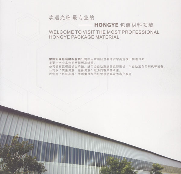 常州宏業(yè)包裝材料有限公司從最初的鮮為人知發(fā)展到現(xiàn)今包裝材料行業(yè)的主流品牌之一。公司生產(chǎn)的包裝材料產(chǎn)品不僅在國內(nèi)已經(jīng)建立了大量的穩(wěn)定的客戶,產(chǎn)品也已遠(yuǎn)銷到國外多個國家和地區(qū),深受客戶的好評。 公司臨近常州經(jīng)濟(jì)要道滬寧高速橫山道口處,主要生產(chǎn)中高檔瓦楞紙板及紙箱,公司擁有瓦楞紙板生產(chǎn)線、進(jìn)口全自動高速四色印刷機(jī)、半自動三色印刷機(jī)等設(shè)備,公司以“質(zhì)量滿意,服務(wù)滿意”做為向客戶的承諾,以創(chuàng)造“包裝品牌”為質(zhì)量目標(biāo)的經(jīng)營理念竭誠為客戶服務(wù)。 公司已通過ISO9001和1400的認(rèn)證。 宏業(yè)包裝的商業(yè)信條:宏業(yè)相信自己會成功, 宏業(yè)相信自己所銷售的商品 ,宏業(yè)員工相信自己所在的公司 ,宏業(yè)相信自己的員工和客戶,宏業(yè)相信成功并不是賺取金錢,而是創(chuàng)造信譽(yù),只有好的信譽(yù),成功才會有價值,宏業(yè)相信世界上最美好最偉大的詞就是“自信”,宏業(yè)相信自已每做一次銷售,就交上一個朋友。