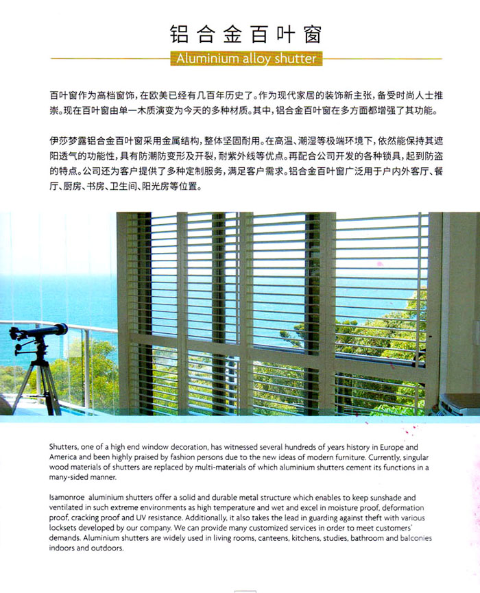 常州伊莎夢(mèng)露百葉窗有限公司成立于2010年,是一家專業(yè)從事高端鋁臺(tái)金百葉窗以及百葉窗五金配件研發(fā)、生產(chǎn)、銷售和服務(wù)的現(xiàn)代化企業(yè)。公司本著“誠(chéng)信為本,客戶至上”的原則。產(chǎn)品遠(yuǎn)銷大洋洲、歐洲、美洲等多個(gè)國(guó)家,并得到客戶的一致認(rèn)可。 目前公司具有比較先進(jìn)的生產(chǎn)設(shè)備及檢測(cè)手段和完善的質(zhì)量保證體系和管理制度,在這基礎(chǔ)上公司每年加大研發(fā)投入,陸續(xù)獲得十多項(xiàng)專利。今后公司還將繼續(xù)堅(jiān)持品牌發(fā)展戰(zhàn)略,提升市場(chǎng)能力,為消費(fèi)者提供更加優(yōu)質(zhì)的產(chǎn)品和服務(wù)。地址:江蘇省常州市經(jīng)濟(jì)開發(fā)區(qū)橫山橋鎮(zhèn)朝陽村大橋工業(yè)園509號(hào)電話:0519-88763142 傳真:0519-88762898網(wǎng)址:www.chinaismr.cn郵箱:Isamonroe-liu@outlook.com 48980807@qq.com