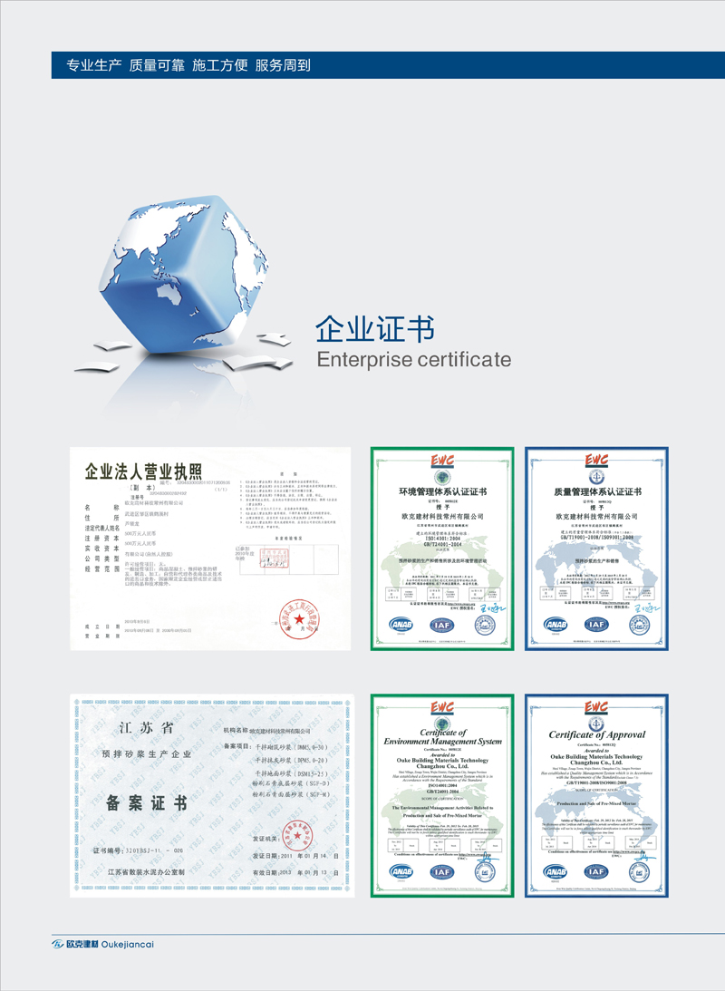 歐克建材科技常州有限公司坐落在中國燈具城之鎮(zhèn)——常州市鄒區(qū)鎮(zhèn)鶴溪村扁擔河畔,是一家經(jīng)江蘇省散裝水泥辦公室備案的預拌砂漿專業(yè)生產企業(yè)。并于2012年2月順利通過了ISO9001質量管理體系認證和ISO14001環(huán)境管理體系認證。 公司集研發(fā)、生產、銷售、物流、服務于一體為客戶提供質量穩(wěn)定、可靠的預拌砂漿產品。投資建設的年產50萬噸,具有雙烘干線的自動化生產線是目前常州地區(qū)生產能力最大、技術含量最高、設備功能最先進的塔樓式干混砂漿生產線。 公司擁有各類經(jīng)驗豐富的專業(yè)技術人員和配置先進的干混砂漿試驗室,可根據(jù)用戶需要生產質量穩(wěn)定可靠、施工方便高效、品種豐富多樣的普通干混砂漿。由專業(yè)技術人員組成的服務團隊,服務于工程現(xiàn)場,進行設備巡檢與產品跟蹤,隨時解決施工中出現(xiàn)的問題。 “質量為根本,信譽贏市場”是企業(yè)生存與發(fā)展的基石。目前,歐克砂漿已得到越來越多的客戶的認可和信賴。
