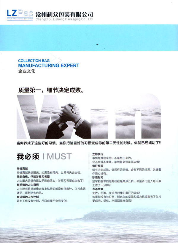 常州利眾包裝有限公司成立于2009年。經(jīng)過10多年的發(fā)展,已發(fā)展成為規(guī)模型的集成袋生產(chǎn)與研發(fā)基地。公司擁有四條拉絲生產(chǎn)線,20余臺各式圓織機、10余臺織帶機,1臺寬幅涂膜機,10余臺自動裁剪機,200多臺各式縫紉設(shè)備,其中電腦縫紉設(shè)備多達(dá)40多臺。公司月產(chǎn)各種中高檔集裝袋20萬條左右。 擁有強大的質(zhì)量管理系統(tǒng)。公司成立初期就通過了ISO9001的體系論證。公司奉行“質(zhì)量第一,客戶至上”的經(jīng)營理念,始終堅持以質(zhì)量謀發(fā)展的原則,執(zhí)著追求以新工藝,新設(shè)備,高效率不斷優(yōu)化生產(chǎn)流程,降低生產(chǎn)成本以適應(yīng)市場。常州利眾包裝有限公司地處美麗的江南水鄉(xiāng)——常州。地理位置十分優(yōu)越。 公司主打產(chǎn)品為各種中高端集裝袋。包括各式拉筋袋,導(dǎo)電袋,抗靜電袋。公司客戶清單中包括有很多的國際知名企業(yè),世界500強企業(yè)。 眾包裝——你的包裝解決方案。