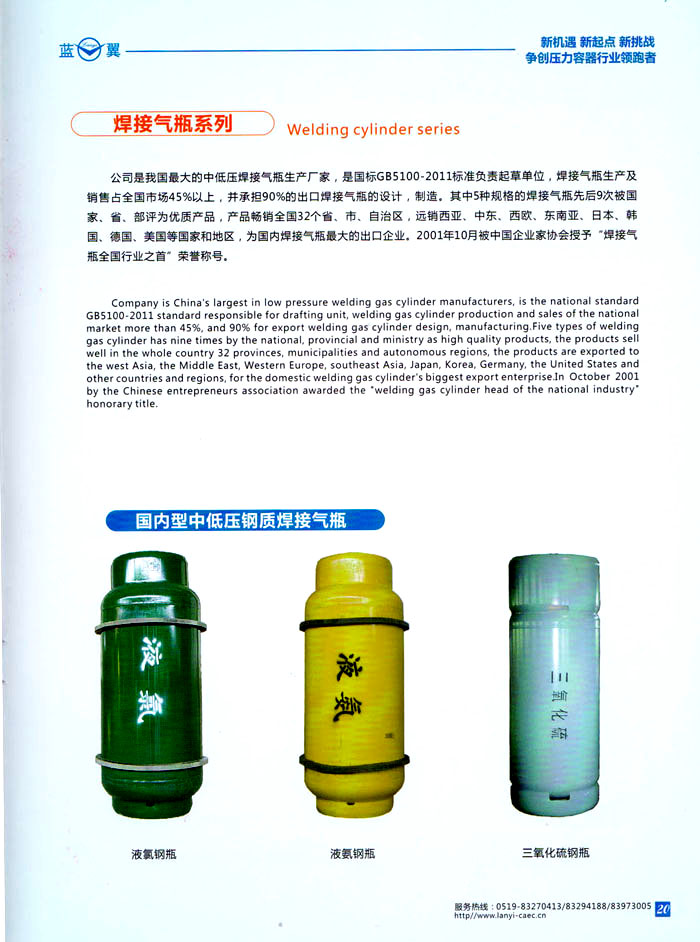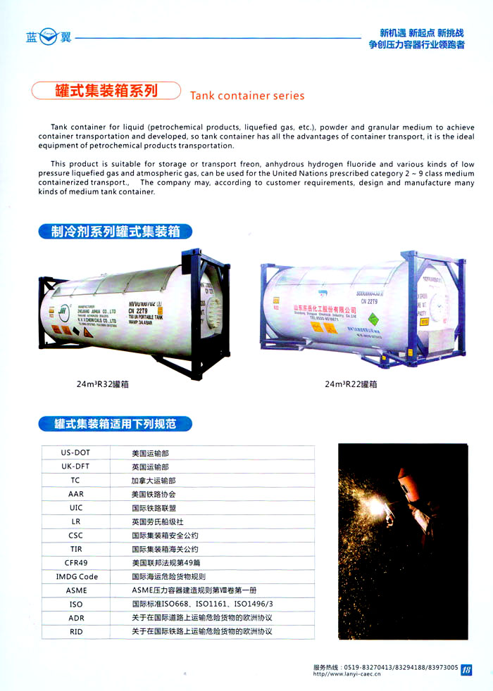 公司DOT4BW100L鋼質(zhì)焊接氣瓶通過美國運(yùn)輸部產(chǎn)品認(rèn)證;20英尺1CC罐式集裝箱通過英國勞氏船級(jí)社和歐盟移動(dòng)壓力設(shè)備指令(TPED)認(rèn)證;壓力容器通過美國機(jī)械工程師學(xué)會(huì)(ASME)鍋爐及壓力容器規(guī)范認(rèn)證。壓力容器制造資格、許可制造產(chǎn)品級(jí)別位列同行業(yè)前茅,曾連續(xù)兩次獲制造資格免審。能設(shè)計(jì)開發(fā)5m³-50m³低溫容器(-196℃)、液氯、液氨、液化石油氣等介質(zhì)的大型儲(chǔ)罐、各類換熱器、50m³-160m³碳鋼-不銹鋼復(fù)合材料PVC聚合槽、VDC貯槽等大型特種設(shè)備、核反應(yīng)堆壓力容器金屬保溫層、控制棒驅(qū)動(dòng)機(jī)構(gòu)復(fù)驗(yàn)臺(tái)架等。建有現(xiàn)代化的液化天然氣(LNG)車用氣瓶生產(chǎn)線,擁有華東地區(qū)比較先進(jìn)、環(huán)保型的現(xiàn)代化大型回火爐熱處理設(shè)備。