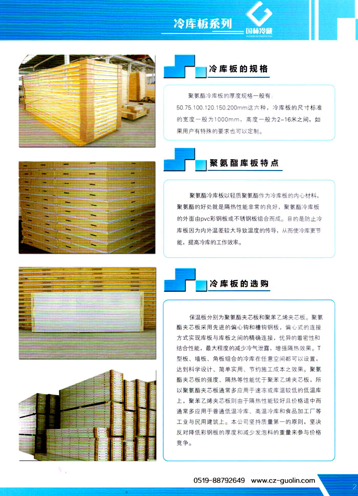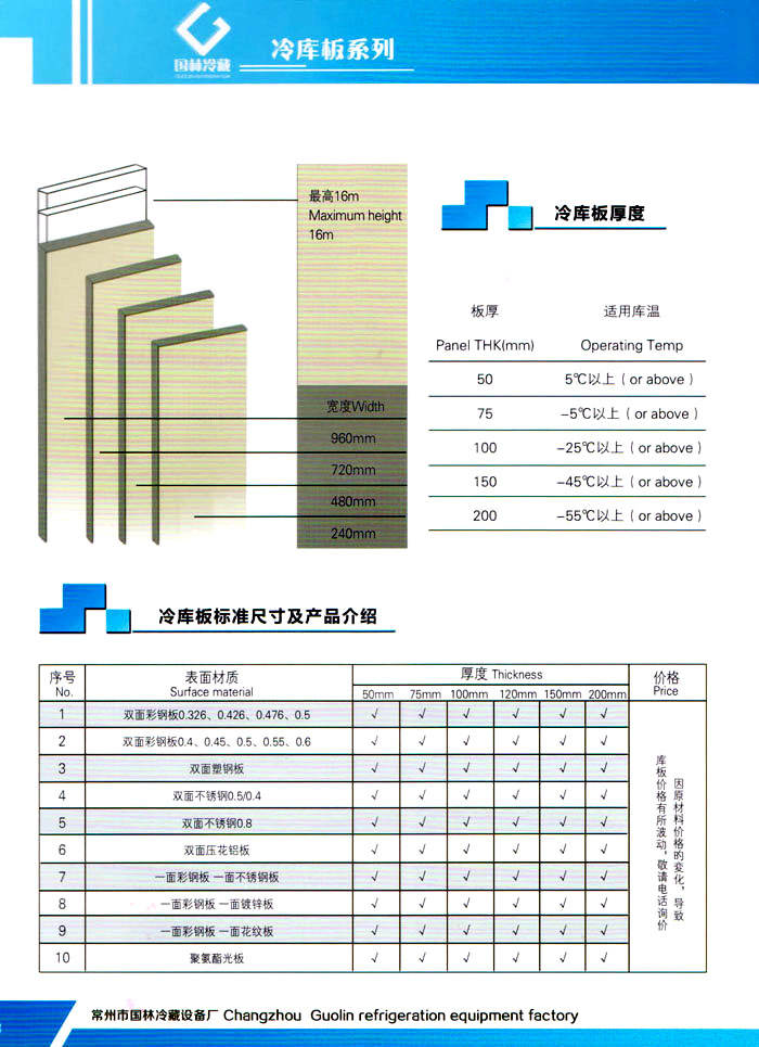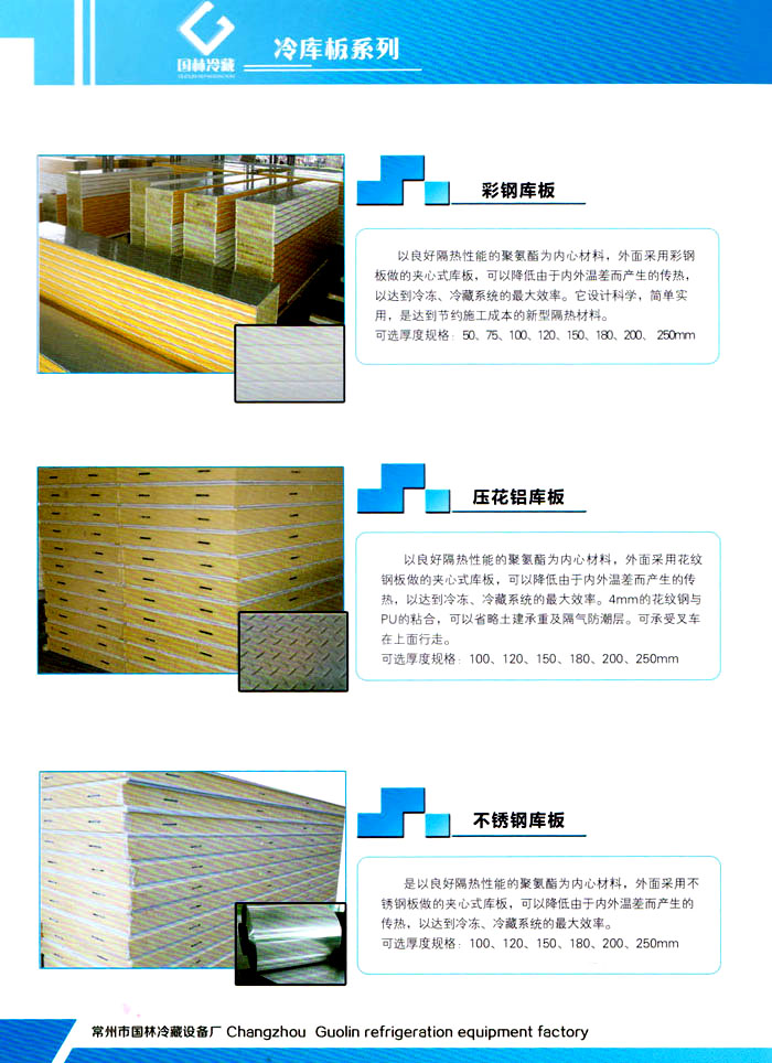 常州市國(guó)林冷藏設(shè)備廠(原武進(jìn)長(zhǎng)虹冷藏設(shè)備廠)成立于1995年,地處江南水鄉(xiāng)中國(guó)富饒的“長(zhǎng)江三角洲”中心區(qū)域—江蘇常州,滬寧高速、沿江高速、312國(guó)道,交通快捷,即刻到達(dá)。 國(guó)林冷庫(kù):公司通過(guò)了ISO9001:2000質(zhì)量體系認(rèn)證,國(guó)林冷庫(kù)多次獲得“江蘇省優(yōu)質(zhì)產(chǎn)品”稱號(hào),全國(guó)質(zhì)量服務(wù)AAAAA示范單位,并且是中國(guó)食品網(wǎng)、阿里巴巴,空調(diào)制冷誠(chéng)信通會(huì)員企業(yè),并與全國(guó)多家設(shè)計(jì)院技術(shù)合作,本廠的誠(chéng)信服務(wù)獲得了廣大客戶的認(rèn)可。 國(guó)林冷庫(kù):中國(guó)制冷行業(yè)的十大冷庫(kù)制造商之一,中國(guó)制冷重要工業(yè)生產(chǎn)基地。本公司***生產(chǎn)保溫庫(kù)板及冷庫(kù)制冷成套設(shè)備,庫(kù)板材料涉及不銹鋼、彩鋼板、玻璃鋼板、保溫聚氨脂板。年產(chǎn)量3000多臺(tái),庫(kù)板30多萬(wàn)平方,歡迎新好客戶前來(lái)訂購(gòu)。 國(guó)林制冷:公司始終堅(jiān)持:“質(zhì)量為上,追求品質(zhì)”的生產(chǎn)方針;始終信奉:“客戶為先,服務(wù)為本”的經(jīng)營(yíng)理念。我們?cè)竿瑥V大的新老客戶在新的世紀(jì)里,共同發(fā)展,利益雙贏,再創(chuàng)輝煌。 常州市國(guó)林冷藏設(shè)備廠***生產(chǎn)7.5公分,10公分,12公分,15公分,20公分的聚氨酯冷庫(kù)板,面板包括彩鋼板、不銹鋼板、壓花鋁板等各種板材,各種冷庫(kù)半埋門(mén)及平移動(dòng)門(mén),各種鐵排管和鋁排管,價(jià)格優(yōu)惠,有需要的可以聯(lián)系我金文燁18761183807