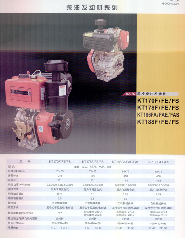 常州常柴集團凱拓電動機械有限公司是常柴集團所屬,集自主研發(fā)設計及生產(chǎn)的出口型產(chǎn)業(yè)基地! 〕2窦瘓F是一家擁有近一萬名在職員工的國有大型企業(yè),年均產(chǎn)值近三億美元,平均出口總額近八千萬美元,同時也是中國內(nèi)地五百強企業(yè)之一! 〕2窦瘓F凱拓電動機械有限公司的主要產(chǎn)品流水線基于日本YAMMAR型超級風冷柴油發(fā)動機,以及其配套發(fā)電機組,水泵機組和數(shù)碼變頻發(fā)電機,我司目前擁有常柴集團及凱拓品牌的知名商標使用權,旗下所有分廠如機械加工廠、鑄造廠以及發(fā)動機廠等生產(chǎn)基地都通過了ISO9001-2000質量管理體系認證。我司自主品牌凱拓柴油發(fā)電機組KT5000SE,KT5000LE,數(shù)碼變頻發(fā)電機KT1000Ti以及柴油發(fā)動機186F均通過德國TUV公司的CE認證,美洲EPA認證,因此出口量很大,近年來公司產(chǎn)品已遠銷美洲、歐洲、非洲以及東南亞國家和地區(qū)! ∫劳谐2窦瘓F的領先技術,強有力的管理體制,以及健全的產(chǎn)品質量體系,我司通過不斷優(yōu)化自主設計研發(fā),完善管理機制,期望能夠以提供最優(yōu)質的產(chǎn)品售后服務進一步拓展國際市場! ”局皥F結、合作、奮斗”的公司理念,我們希望著眼全球,與更多潛在的客戶開展合作交流,最終實現(xiàn)雙贏的戰(zhàn)略目標。