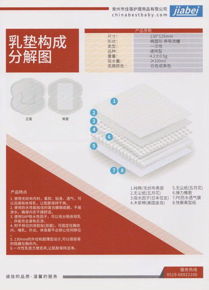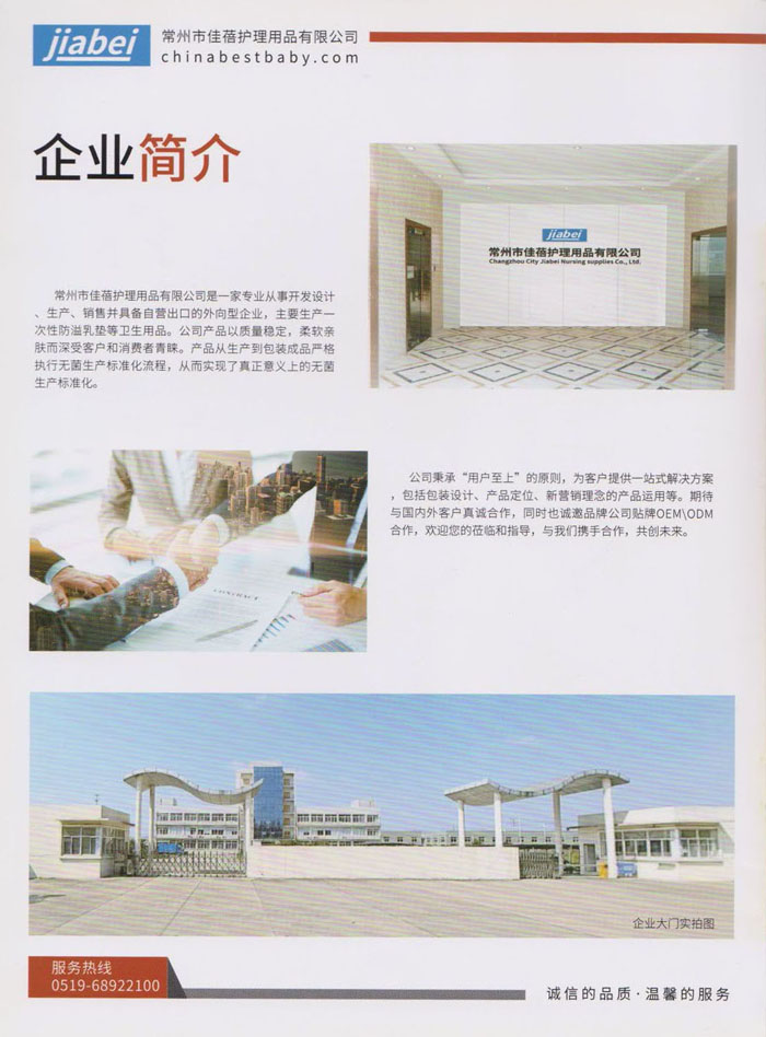 常州市佳蓓護理用品有限公司是一家專業(yè)從事開發(fā)、生產(chǎn)、銷售并具備自營出口的外向型企業(yè),主要生產(chǎn)“一次性防溢乳墊“,以質量穩(wěn)定,柔軟親膚而深受客戶和消費者青睞。本公司產(chǎn)品從生產(chǎn)到包裝成品嚴格執(zhí)行無菌生產(chǎn)標準化流程,并和設備生產(chǎn)廠家合作開發(fā)了兩條從進料、生產(chǎn)、檢測、滅菌、成品包裝的無菌生產(chǎn)線,從而實現(xiàn)了真正意義上的無菌生產(chǎn)標準化。 佳蓓秉承”用戶至上“的原則,期待與國內(nèi)外客戶真誠合作,同時也誠邀品牌公司貼牌合作,歡迎您的蒞臨和指導,與我們攜手合作,共創(chuàng)未來。