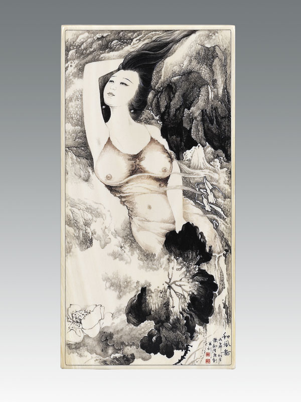 1 牙刻《和風圖》是極具創(chuàng)意構(gòu)思新穎的原創(chuàng)作品,水墨雅韻橫生,荷花玉色高潔,仙子和風飄逸。作品以花擬人以人喻花,兼工帶寫相應成輝,刀法隨意而變,大膽強調(diào)紅與黑的民族審美符號,抒發(fā)作者對美的呼喚、對荷的傾訴。仙子冰雪的肌膚,豐美的體態(tài),洋溢著青春的氣息,散發(fā)出蓬勃的生機。