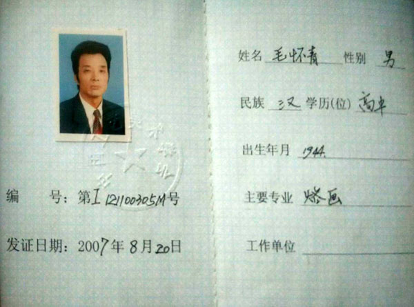 毛懷青,江蘇常州市武進(jìn)人。 中國工藝美術(shù)學(xué)會會員,常州市中國烙畫研究會副會長,常州市文博鑒賞協(xié)會理事,非物質(zhì)文化遺產(chǎn)烙畫傳承人。高級工藝美術(shù)師。 年輕時學(xué)習(xí)國畫、油畫中年蔓現(xiàn)掌州咯畫源遠(yuǎn)流長、歷史悠久,有著其它美術(shù)門類不具備的藝術(shù)風(fēng)格與特色?芍^是工藝美術(shù)中的一朵十分亮麗的藝術(shù)奇葩,是我民族先人給我們留下的一份不可多得十分珍貴的一份文化遺產(chǎn)。為弘揚與發(fā)展這份優(yōu)秀文化遺產(chǎn),我從此下定決心研究烙畫,愿付出一份力量為振興烙畫事業(yè)做出貢獻(xiàn)。至今已潛心研究幾十年,取得了可喜的成績,被業(yè)界公認(rèn),社會關(guān)注與認(rèn)可。有“江南烙畫第一筆”之美譽。 近年來,創(chuàng)作的烙畫作品分別獲得過全國、省市級的金、銀、銅獎多次。中央電視臺曾兩次播放過本人的烙畫作品,江蘇電視臺、常州電視臺也曾多次播放過本人的作品與烙畫藝術(shù)生涯,揚子晚報、常州日報、常州晚報也曾多次報導(dǎo)過本人的烙畫作品,出版物有三種版本都能查閱到介紹本的烙畫從藝生涯與藝術(shù)業(yè)績。