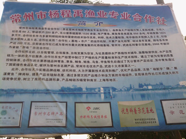 楊程禹漁業(yè)專業(yè)合作社(原名稱為常州市楊新宇漁業(yè)專業(yè)合作社)位于常州市武進(jìn)區(qū)洛陽鎮(zhèn)戴溪村,成立于2003年,是一家專業(yè)從事水產(chǎn)品養(yǎng)殖生產(chǎn)經(jīng)營的農(nóng)民專業(yè)合作經(jīng)濟(jì)組織,合作社占地3500平方米,建筑面積2500平方米,擁有各類資產(chǎn)近200萬元。合作社有社員60人,養(yǎng)殖面積1500畝,有大專以上學(xué)歷2人,中級技術(shù)職稱人員2名,初級技術(shù)職稱人員5名,合作社建有高標(biāo)準(zhǔn)的水產(chǎn)養(yǎng)殖核心基地200畝,增氧機(jī)、投料機(jī)等養(yǎng)殖設(shè)備30多臺套。2008年實(shí)現(xiàn)銷售收入311萬元,實(shí)現(xiàn)利潤39萬元。