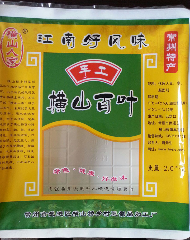 橫山橋鄉(xiāng)村豆制品加工場坐落于風(fēng)景秀麗,人杰地靈的武進(jìn)區(qū)橫山橋鎮(zhèn)奚巷村,其生產(chǎn)的“橫山人家”牌手工百葉,采用優(yōu)質(zhì)大豆為原料,用大鐵鍋煮漿,全手工澆制,完美地傳承了橫山橋百葉獨有的柔、嫩、純、香的特色,豆香味濃郁,口感細(xì)膩,無豆腥氣,保留了大豆低聚糖,卵磷脂,大豆異黃銅,維生素等營養(yǎng)成分,可烹飪多種菜肴。產(chǎn)品主要銷往上海、南京以及常武地區(qū)的各大飯店,深受人們的喜愛。 多年來,我們積極倡導(dǎo)“誠信如同生命,口碑重于泰山”的經(jīng)營理念,高度重視產(chǎn)品質(zhì)量和衛(wèi)生,力爭讓“橫山人家”品牌豆制品成為消費者最安全!最貼心!最認(rèn)可的橫山橋百葉品牌。