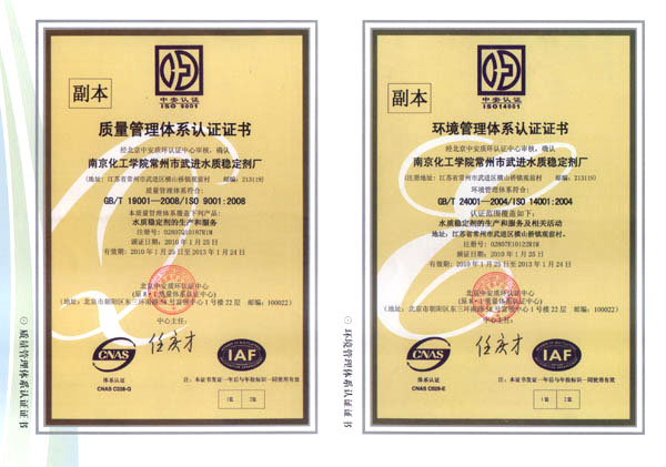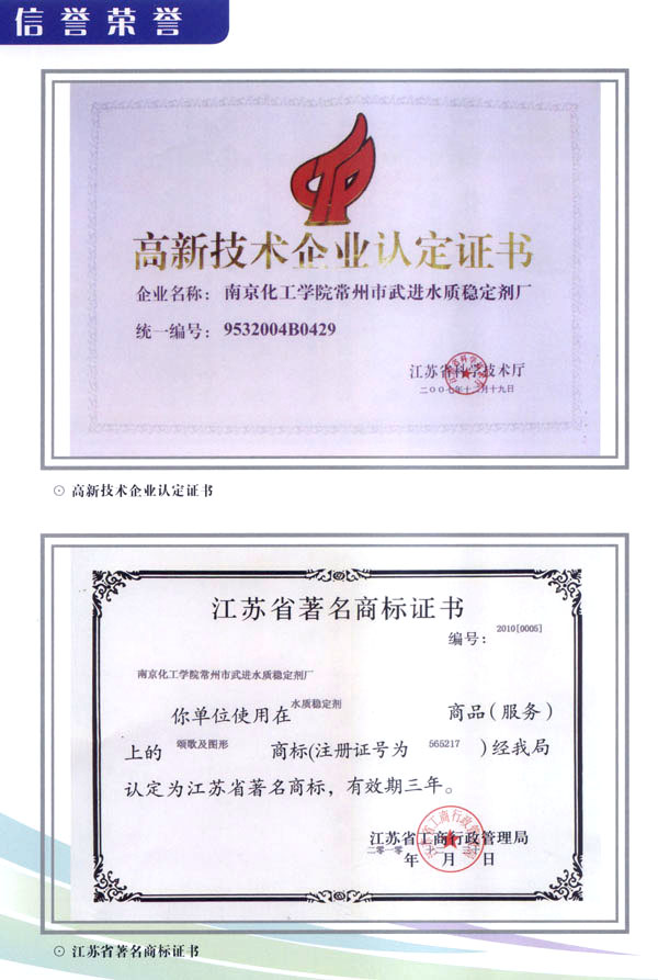 企業(yè)運(yùn)用嚴(yán)密的科學(xué)管理,配有先進(jìn)的工藝技術(shù)和精良的生產(chǎn)裝備,保持高標(biāo)準(zhǔn)的產(chǎn)品質(zhì)量。所生產(chǎn)的水質(zhì)穩(wěn)定劑達(dá)到或超過(guò)國(guó)際先進(jìn)水平,擁有PBTCA等多個(gè)江蘇省高新技術(shù)產(chǎn)品,DPSC緩蝕阻垢劑被列為國(guó)家星火計(jì)劃項(xiàng)目,工業(yè)循環(huán)水用新型緩蝕阻垢殺菌劑被國(guó)務(wù)院評(píng)為國(guó)家科技進(jìn)步二等獎(jiǎng)。主要產(chǎn)品均通過(guò)部、省級(jí)科技成果鑒定,連續(xù)十多年被中國(guó)石化總公司評(píng)定為合格推薦產(chǎn)品。企業(yè)已通過(guò)IS09001、IS014001國(guó)際質(zhì)量、環(huán)境認(rèn)證,為國(guó)內(nèi)外石化行業(yè)、冶金、鋼鐵、化肥、電力、紡織等領(lǐng)域的工業(yè)循環(huán)冷卻水的水質(zhì)處理提供了必不可少的配套產(chǎn)品。