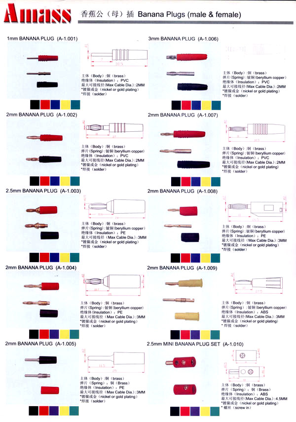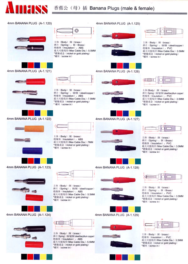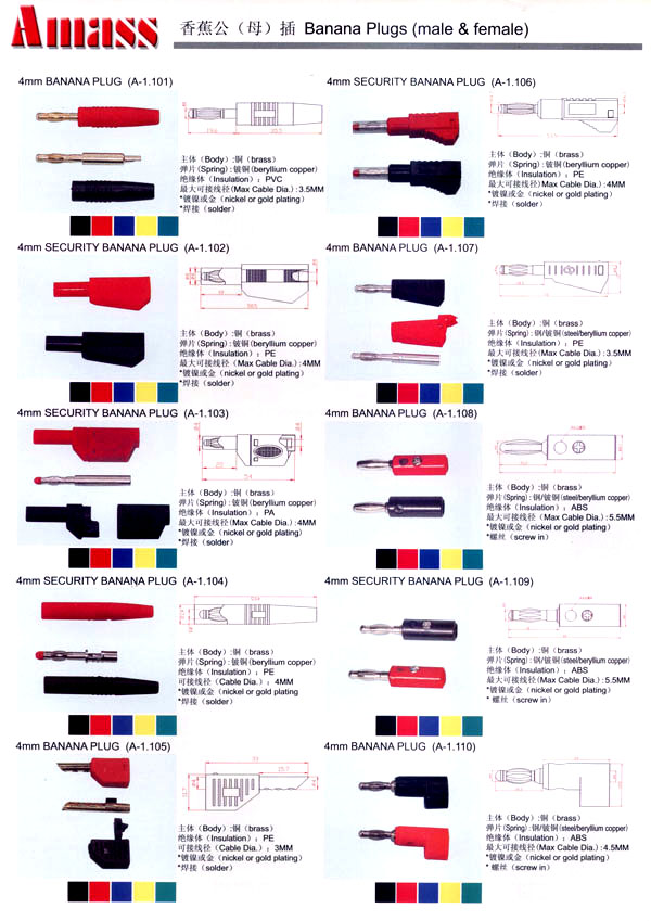 本公司專業(yè)生產(chǎn)各類香蕉插頭,香蕉插座,接線柱,電瓶夾,鱷魚夾,測試導(dǎo)線,測試筆等。產(chǎn)品分2mm/2.5mm/3mm/3.5mm/4mm五大系列,百余種款式, 各種香蕉插廣泛用于儀器、儀表、電力測試、教學(xué)、玩具,視聽設(shè)備、醫(yī)療儀器,保健產(chǎn)品等領(lǐng)域。公司技術(shù)力量雄厚,生產(chǎn)工藝先進,產(chǎn)品遠銷港、臺、歐美,并與飛利浦等國際品牌配套。公司本著精益求精的理念,歡迎新老客戶光臨。 我們擁有資深的工程師和豐富的電子產(chǎn)品銷售經(jīng)驗,專業(yè)生產(chǎn)各類電子接插件產(chǎn)品。 香蕉插頭,香蕉插座,電瓶夾,鱷魚夾等品種齊全、 質(zhì)量可靠,致力服務(wù)于通訊、數(shù)據(jù)通信、消費類電子產(chǎn)品、計算機和計算機外圍設(shè)備以及工業(yè)應(yīng)用等領(lǐng)域,能給客戶提供全面采購解決方案。 我們秉承穩(wěn)健作風(fēng)、誠實經(jīng)營、合理價格、完善服務(wù)的宗旨,在全體客戶的支持下,公司不斷創(chuàng)新進取,業(yè)績蒸蒸日上,已與數(shù)十家電子零件制造商及其分支機構(gòu)建立密切合作關(guān)系,在國內(nèi)擁有數(shù)百家固定客戶。