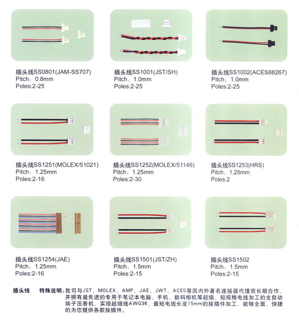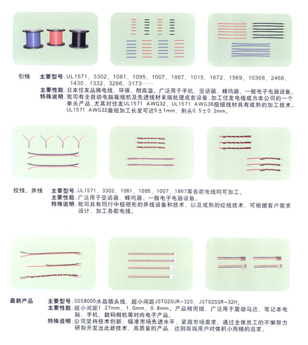 常州市匯創(chuàng)電子有限公司我公司2000年8月成立.端子連接線生產(chǎn)有10余年的經(jīng)驗(yàn).結(jié)合韓國(guó)連接線生產(chǎn)技術(shù),致力于筆記本電腦,手機(jī),數(shù)碼相機(jī)等高端行業(yè)的小間距的端子連接線的研究和生產(chǎn).小間距端子連接線的插頭的常規(guī)型號(hào)有 SH/1.0mm, 51021-0200/1.25mm, ZH , PH, EH, XH, SAN, SCN, 2510 等.特殊插頭型號(hào)有:02SUR-32S,02SSR-32H.材料用原廠進(jìn)口的JST, MOLEX,或臺(tái)資廠家的(根據(jù)客戶需要).全環(huán)保,無鉛化生產(chǎn).2008年開始導(dǎo)入無鹵素要求。企業(yè)已經(jīng)通過ISO9001-2000質(zhì)量管理體系.質(zhì)量好!交貨快!價(jià)格合理!是目前常州AAC等多家大型受話器廠家的優(yōu)秀供應(yīng)商.客戶遍及常州周邊,蘇州,昆山,上海,深圳,嘉興,山東,重慶等地.也有直接出口韓國(guó),臺(tái)灣.現(xiàn)有高素質(zhì)員工100人左右.廠房面積2000平方米.
