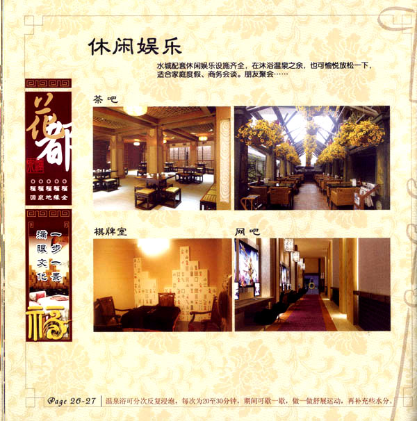 花都溫泉水城包括洗浴區(qū)、戲水世界、露天溫泉、自助餐廳、生態(tài)房、別墅區(qū)、紅文化房、VIP區(qū)等多種功能區(qū)域,是集溫泉養(yǎng)生、休閑住宿、演藝會(huì)務(wù)為—體的休閑度假勝地,給賓客帶來江南小鎮(zhèn)的浪漫水城之旅。