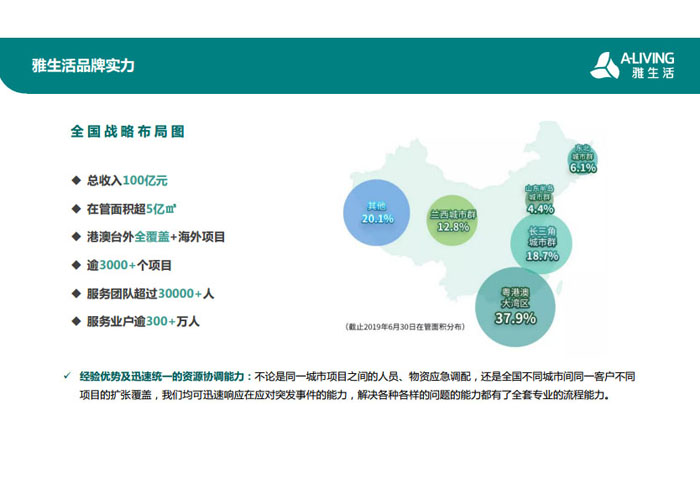 一、立足北上廣,面向全中國,走向全世界 1992年,雅居樂物業(yè)開篇中山,率先引入港式物業(yè)管理模式。1997年,依托雅居樂地產(chǎn)的崛起,連續(xù)接管中山多個項目,成為高端大盤物業(yè)管理的領(lǐng)跑者。1999年,雅居樂物業(yè)開啟專業(yè)化發(fā)展模式,全面通過英國皇家BSI的ISO9000質(zhì)量管理體系認證,2001年成為國家首批一級物業(yè)管理資質(zhì)企業(yè)。 2002年,隨著廣州雅居樂花園的盛大啟幕,雅居樂物業(yè)邁開向廣州進軍的步伐。為尋求更長遠的發(fā)展,雅居樂積極構(gòu)思上市藍圖,2005年在香港成功上市。在深耕珠三角城市群的同時,2006年雅居樂物業(yè)揮師北上,正式開啟全國部署戰(zhàn)略。2008年,接管海南清水灣項目,揭開旅游地產(chǎn)物業(yè)管理的新篇章。 接下來近十年里,雅居樂物業(yè)始終保持著最年輕的成長姿態(tài),依托“管理數(shù)字化、服務(wù)專業(yè)化、流程標準化和操作機械化”的發(fā)展戰(zhàn)略,雅居樂物業(yè)榮膺2018中國物業(yè)服務(wù)百強企業(yè)第11名,2018年中國物業(yè)服務(wù)百強企業(yè)成長性第二名、2018年中國物業(yè)服務(wù)百強服務(wù)質(zhì)量領(lǐng)先企業(yè)、2018年中國物業(yè)服務(wù)百強滿意度領(lǐng)先企業(yè)、2018中國物業(yè)服務(wù)百強經(jīng)營績效領(lǐng)先企業(yè)、旅游地產(chǎn)物業(yè)管理領(lǐng)先品牌、2018年中國辦公物業(yè)管理優(yōu)秀企業(yè)(綠地物業(yè))、2017中國物業(yè)管理企業(yè)品牌價值第12名、2017中國物業(yè)管理企業(yè)綜合實力第12名、中國藍籌物業(yè)企業(yè)、《旅游地產(chǎn)物業(yè)管理服務(wù)標準》(團體標準)起草工作等多項殊榮。 目前,雅生活集團已形成廣州、中山、深圳、南京、上海、西安、成都、海南、云南、北京、鄭州、南寧、沈陽、武漢、馬來西亞十五大城市公司全面發(fā)展的蓬勃態(tài)勢。截止2017年12月31日,雅生活集團管理范圍覆蓋全國逾69座城市與地區(qū),服務(wù)類型涵蓋主流住宅、高端豪宅、旅游地產(chǎn)、商業(yè)、寫字樓等多種業(yè)態(tài),合約總建筑面積為12610萬平方米,擁有200多個項目,服務(wù)業(yè)主逾100萬人。 2017年6月,雅生活集團收購綠地物業(yè)100%股權(quán),并與綠地集團簽署戰(zhàn)略合作協(xié)議,8月,綠地集團投資10億元獲得雅生活集團20%股權(quán)。未來,雅生活集團將實施“雅居樂物業(yè)”與“綠地物業(yè)”雙品牌驅(qū)動戰(zhàn)略,還將尋求在A股上市,力爭打造中國物業(yè)“A+H”第一股。
