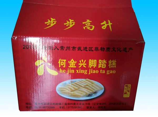 常州鄭陸何金興腳踏糕制作坊從事腳踏糕制作工藝200多年,五代傳承,制作面積300平方米左右,腳踏糕是用黏性大的米或米粉蒸成的糕,是中國農(nóng)歷年的應(yīng)時食品。春節(jié),我國很多地區(qū)都有講究吃年糕。年糕有紅、黃、白三色,象征金銀,年糕又稱“年年糕”,與“年年高”諧音,寓意著人們的工作和生活一年比一年提高。所以前人有詩稱年糕:“年糕寓意稍云深,白色如銀黃色如金。年歲盼高時時利,虔誠默祝望財(cái)臨!绷碛姓憬幉ㄊ薪眳^(qū)慈城鎮(zhèn)的水磨年糕也是特別有名。