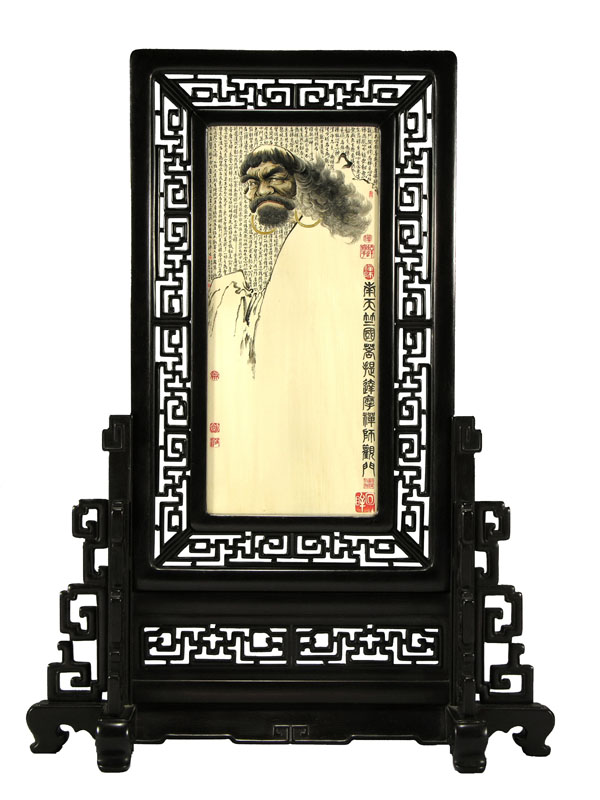 2牙刻《回眸》傳神的刻畫了達(dá)摩禪師回眸間投來的眼神,就像一位飽經(jīng)風(fēng)霜的老者,有幾經(jīng)坎坷的人生故事向你訴說,有多少世態(tài)炎涼人生哲理向你傳遞;仨g風(fēng)中飄逸的須發(fā)、寬聳的鼻梁、緊鎖的眉頭,乃至畫面中作者極力奉獻(xiàn)給觀者的、達(dá)摩那炯炯有神的眼睛,像大海那么寬廣、像宇宙那么深遂。畫面背景銘刻達(dá)摩相關(guān)禪的精辟論著,更顯佛的天國,禪的意境。幾枚大小相間的朱紅印章散發(fā)幾分文雅氣息。人物的須發(fā)看似瀟灑的筆墨一揮而就,其實借助放大鏡看去烏黑發(fā)亮、密密層層的須發(fā)根根可數(shù)、飄逸迷人。既突出筆墨與刀法,又凸顯內(nèi)涵與精神,是作者勤于雕刻而又修煉于雕刻之外的結(jié)晶。 此作獲首屆中國華東工藝美術(shù)精品展特等金獎,為中國工藝美術(shù)館珍藏。