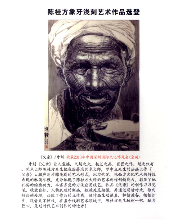 陳桂方,江蘇常州武進人,中國著名雕刻藝術家,江蘇省工藝美術大師、研究員級、高級工藝美術師,江蘇省非物質(zhì)文化遺產(chǎn)《象牙淺刻》代表性傳承人。畢業(yè)于中國書畫函授大學,深造于清華大學、南大美術系,現(xiàn)任中國工藝美術協(xié)會會員,江蘇省工藝美術學會理事,常州市工藝美術家協(xié)會副秘書長,常州市工藝美術行業(yè)協(xié)會常務理事,武進工藝美術協(xié)會副主席。陳桂方大師淺刻作品的藝術特點:山水氣韻生動,氣勢磅礴,場面壯觀,刀法細膩:人物仕女生動可人,栩栩如生,充分表達體現(xiàn)了中國象牙工藝獨具的內(nèi)在文化底蘊和現(xiàn)代社會的審美觀念及獨特的淺刻藝術表現(xiàn)技藝。對每件藝術作品創(chuàng)作都精益求精,強調(diào)藝術創(chuàng)作的思想性、意境及內(nèi)涵。注重章法構思,掌握牙刻藝術的特性表現(xiàn),作品具有鮮明生動的時代氣息,獨具所創(chuàng)工筆與寫意相結合的牙刻藝術表現(xiàn)手法和表現(xiàn)形式,出眾、飄逸、多變的刀法技藝,粗獷處見細微、方寸間見大觀的創(chuàng)作理念深受專家權威的肯定和業(yè)內(nèi)人士的一致好評。陳桂方大師至企頑事象牙淺刻藝術創(chuàng)作近四十余載,完善了自己的創(chuàng)作體系,成就了自己獨特的藝術風格。作品數(shù)年來連續(xù)二十多次榮獲國家最高藝術精品大獎《金獎》,象牙淺刻作品《李逵探母》已被國家工藝美術館收藏,并頒發(fā)了國家收藏證書,在全國數(shù)十年間尚屬首次。當前,陳桂方牙刻藝術作品已深受廣大海內(nèi)外業(yè)內(nèi)人士、收藏家們的鐘愛、青睞、熱藏,并被譽為當代最杰出最具潛質(zhì)的實力派藝術大師。