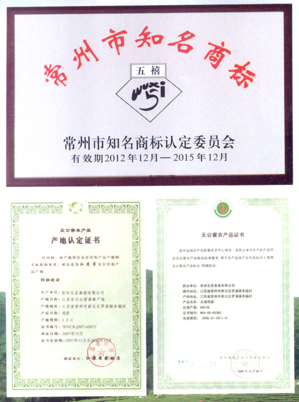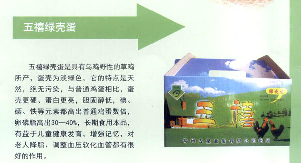 經(jīng)多年努力實現(xiàn)了“五禧”產(chǎn)品系列化,F(xiàn)公司每年向市場提供有“五禧”鮮雞蛋,“五禧”土雞蛋,“五禧”ELC蛋,“五禧”綠殼草雞蛋,成為了不同消費群體的理想選擇!拔屐钡岸啻螛s獲常州市場知名商標稱號。
