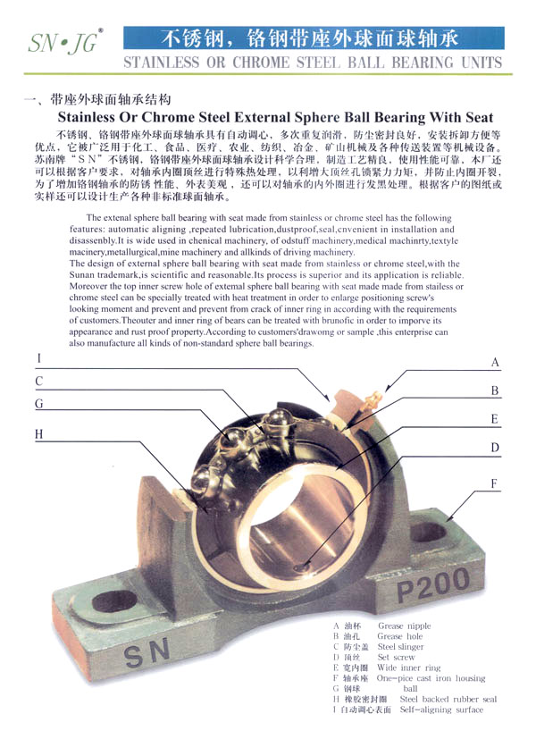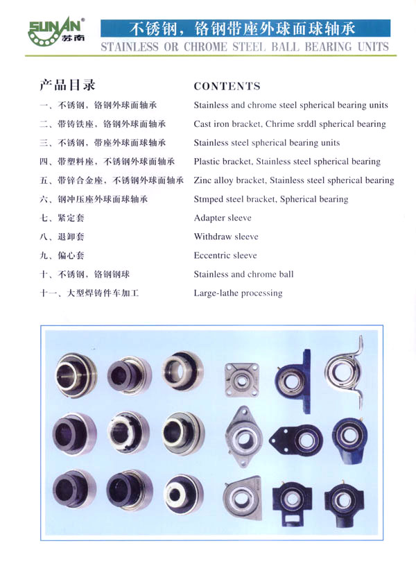 常州市武進(jìn)蘇南軸承有限公司是生產(chǎn)鋼球及帶座外球面軸承的專業(yè)工廠,主要生產(chǎn)蘇南牌“SN”不銹鋼球、鉻鋼鋼球,以及不銹鋼、鉻鋼UC、UCX、UK、HC、SB、SA、SER、UOOO、KOOO及其它非標(biāo)系列各類帶座外球面軸承、偏心套、緊定套等產(chǎn)品。本廠生產(chǎn)規(guī)格有軸承鋼球0.5-150m/m,碳鋼球0.5-150m/m,不銹鋼球0.8-50m/m,同時定做各種特殊規(guī)格的不銹鋼球、銅球、陶瓷球等。為廣大用戶提供品質(zhì)優(yōu)良,規(guī)格齊全,價格合理的各種鋼球。 本公司位于常州南部,錫宜高速公路串境而過, 交通便利。南瀕風(fēng)景秀麗的太湖,沿湖丘陵地帶人文景觀豐富,為常州市武進(jìn)區(qū)太湖旅游度假區(qū) 。本廠環(huán)境優(yōu)美,具有良好的生產(chǎn)環(huán)境,我們竭誠歡迎國內(nèi)外的朋友進(jìn)行廣泛多樣的經(jīng)濟(jì)合作交往和貿(mào)易合作,并為你提供優(yōu)良的服務(wù)。 本公司技術(shù)力量雄厚,工藝裝備先進(jìn),檢測手段完備,產(chǎn)品質(zhì)量穩(wěn)定,使用性能各項指標(biāo)都達(dá)到國際先進(jìn)水平,產(chǎn)品主要銷往美國、法國、德國、日本、意大利、澳大利亞、韓國、加拿大、及東南亞等國家和地區(qū)。本公司的“SN”商標(biāo)鋼球及帶座外球面軸承已贏得國內(nèi)外廣大用戶的信賴。 本公司具有外貿(mào)自營出口權(quán),并于2002年9月通過ISO9001-2000版質(zhì)量體系認(rèn)證,于2004年8月通過“CQC”產(chǎn)品質(zhì)量認(rèn)證。