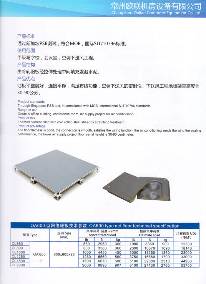 防靜電高架活動地板、全鋼地板、陶瓷地板是計(jì)算機(jī)行業(yè)發(fā)展起來的新型鋪地材料,隔離了潮氣、靜電灰塵,最重要的是解決了綜合布線問題,無需預(yù)埋管線,可隨時(shí)拆卸、搬移,保證了資訊設(shè)備完整的優(yōu)點(diǎn),適應(yīng)了智能化樓宇中信息自動化技術(shù)對所處環(huán)境的特定要求,避免了廣大客戶的雙重投資,使現(xiàn)代化辦公程度更加高效,辦公場所更加舒適。 “歐聯(lián)”系列全鋼地板,符合國家安全要求,種類完備多樣,其中防靜電陶瓷地板、硫酸鈣地板等除具有普通瓷質(zhì)的裝飾和實(shí)用性外,其耐磨、防水、防火功能優(yōu)于其它同類產(chǎn)品,防靜電系列地板,能切合不同客戶的要求,其靈活的配置,深受客戶歡迎,不同材質(zhì)的地板結(jié)構(gòu)使設(shè)計(jì)師的設(shè)計(jì)空間比傳統(tǒng)的更加廣闊自由和善變。 公司大力發(fā)展國內(nèi)外銷售業(yè)務(wù),多次中標(biāo)國內(nèi)重點(diǎn)工程 ,例:哈爾濱醫(yī)科大學(xué)、山東大學(xué)、上海普通機(jī)場等。 公司將一如既往開發(fā)和制造一流的產(chǎn)品,愿與廣大有識之士合作發(fā)展,共創(chuàng)美好未來。