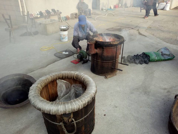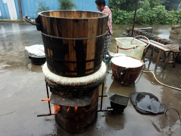 第一步:蒸糯米飯,老徐先用煤爐將水燒開(kāi),再將洗凈泡好的糯米放入一只大木桶中,放在爐子上蒸。除此以外,老徐還要不斷攪拌,保證糯米受熱均勻,直至散發(fā)出水蒸氣。為了保證米飯溫度,老徐特地用塑料薄膜將木桶封住,并用皮筋加固。蒸糯米飯,大約需要半個(gè)多小時(shí)。