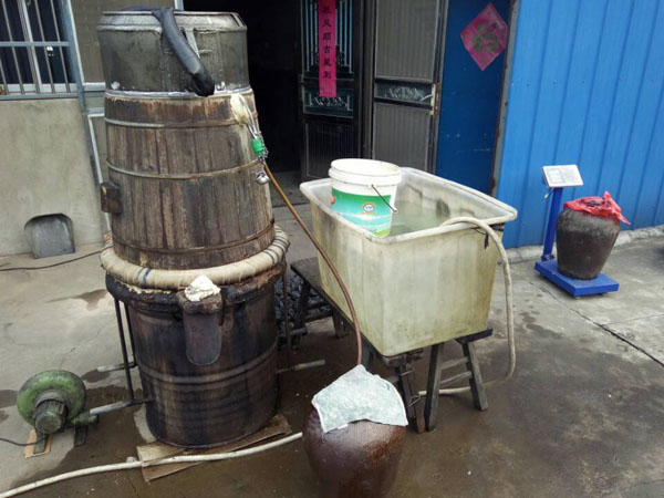 第四步:放入缸中,酒曲和糯米拌好后,便可放入屋內(nèi)的大缸中,并在其中挖出個(gè)圓形的洞,放入竹筒做酒窩。在此之前,大缸可用之前冷卻糯米飯的溫水擦一擦暖缸,這樣更有益于酒曲發(fā)酵。為了保證酒曲發(fā)酵的溫度,還要給酒料附上塑料薄膜。若是氣溫低于零度,還得多蓋上幾層棉被才行。像池阿姨家的400斤糯米,老徐至少要重復(fù)這些步驟八遍!大缸中的酒料大約發(fā)酵了10天左右,在酒乳已非常豐富之際,按照1:1的比例,打開(kāi)封口加入冷開(kāi)水,然后再蓋上棉被。繼續(xù)放置45天后,米酒才算大功告成!如果覺(jué)得米酒不過(guò)癮,老徐還會(huì)將米酒吊成燒酒,也就是白酒,依舊是傳統(tǒng)的老手藝。未來(lái)某天,TA會(huì)消失 ,其實(shí),做米酒的方法并不難,幾乎是以前家家戶戶的必備技能。然而現(xiàn)如今,不僅老常州們不再自己做酒,就連像老徐這樣的做米酒手藝人也越來(lái)越少。就連跟了老徐三十多年的一套米酒家當(dāng),也同樣經(jīng)不起歲月:鐵鍋漏了要去找橫山橋的老師傅;木桶壞了要去禮嘉修;爐子也有專門的式樣,過(guò)幾年就要拿著圖紙找人翻新......
