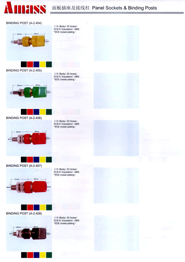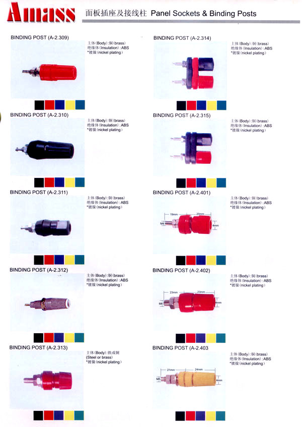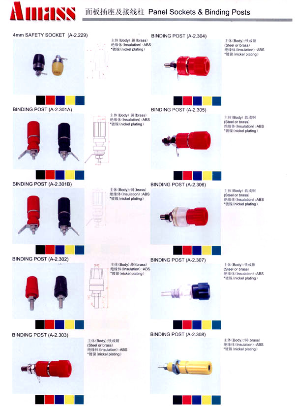 本公司專業(yè)生產(chǎn)各類香蕉插頭,香蕉插座,接線柱,電瓶夾,鱷魚夾,測試導線,測試筆等。產(chǎn)品分2mm/2.5mm/3mm/3.5mm/4mm五大系列,百余種款式, 各種香蕉插廣泛用于儀器、儀表、電力測試、教學、玩具,視聽設備、醫(yī)療儀器,保健產(chǎn)品等領域。公司技術力量雄厚,生產(chǎn)工藝先進,產(chǎn)品遠銷港、臺、歐美,并與飛利浦等國際品牌配套。公司本著精益求精的理念,歡迎新老客戶光臨。