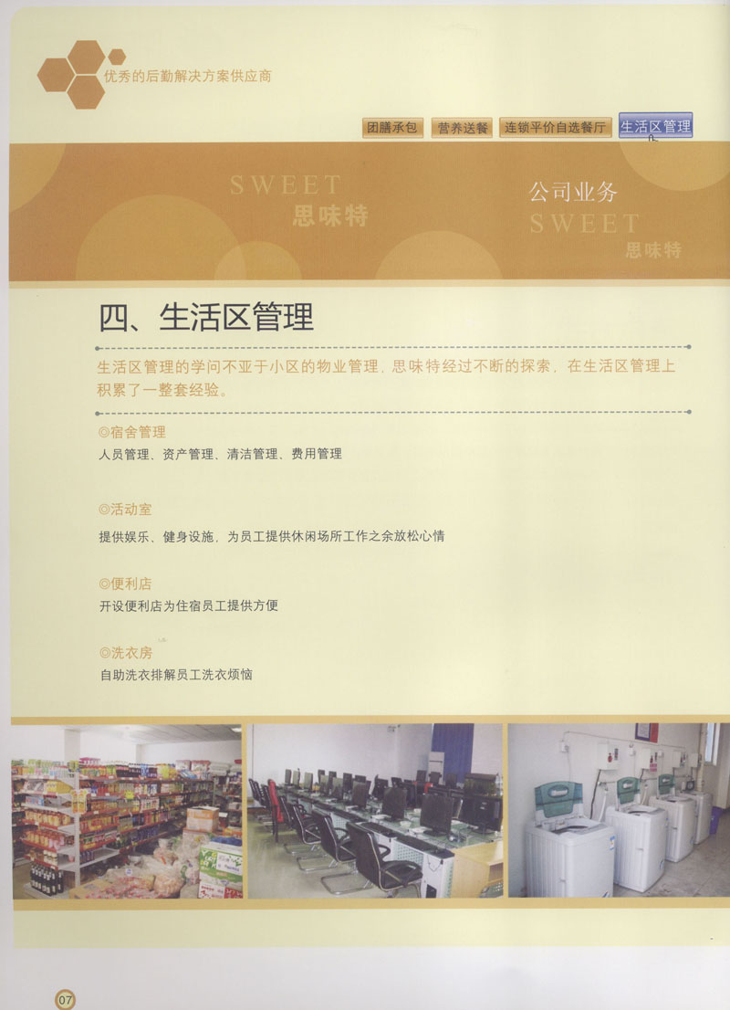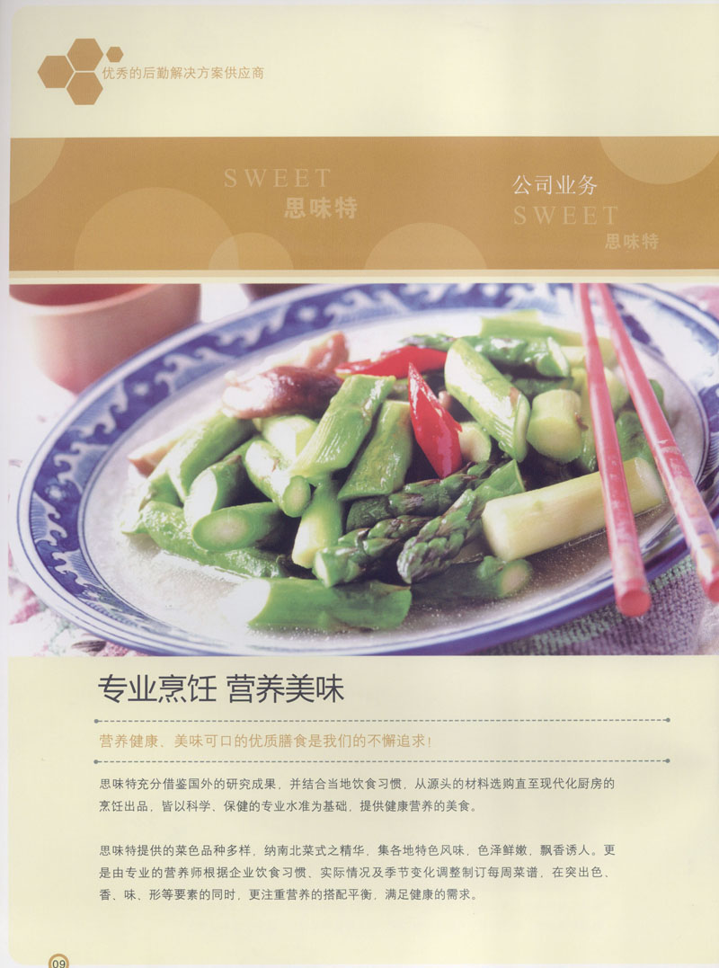 常州市思味特餐飲有限公司是一家專業(yè)從事企事業(yè)后勤服務(wù)的有限責(zé)任公司,公司從承包食堂起步,逐漸發(fā)展為經(jīng)營團(tuán)膳承包、營養(yǎng)送餐、生活區(qū)管理、連鎖餐廳的綜合型企業(yè)。2008年公司斥資100萬元,在常州興建了可以同時(shí)提供3000餐膳食的中央廚房,重點(diǎn)打造“和美客”后勤服務(wù)品牌,全力為企事業(yè)單位解決后勤后顧之憂。