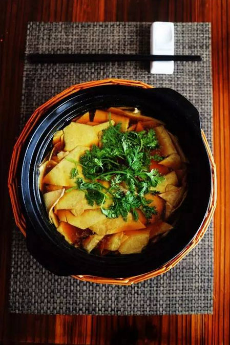 油湯橫山橋百葉 Q嫩爽滑、豆香濃郁的百葉深受老常州人的喜愛,在常州以橫山橋的最為知名。采用太湖灣農(nóng)家散養(yǎng)的土雞熬湯,雞油透亮,雞湯香醇,滿滿一鍋雞味滲透在百葉之中,美味可見一斑。這是一道跨越常州地域,卻結(jié)合常州各地物產(chǎn)的佳肴,也讓往來食客深深地感受到了太湖美,常州更美。