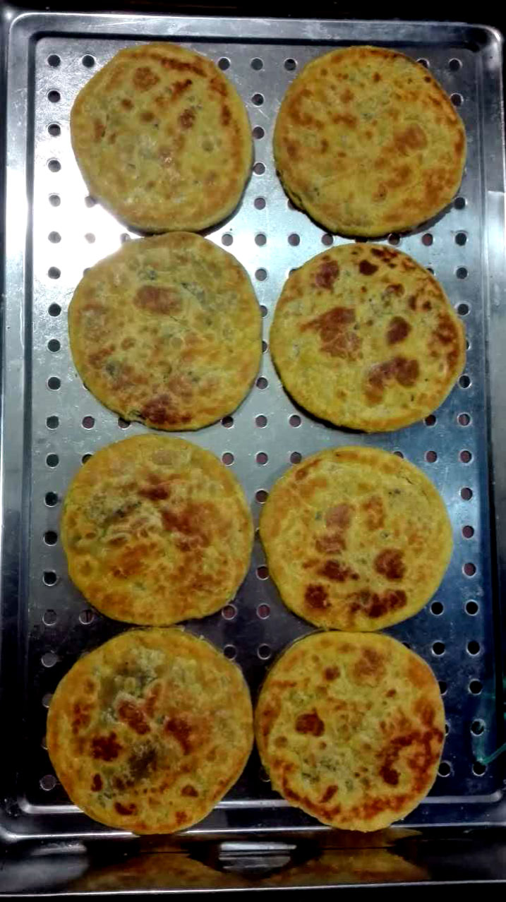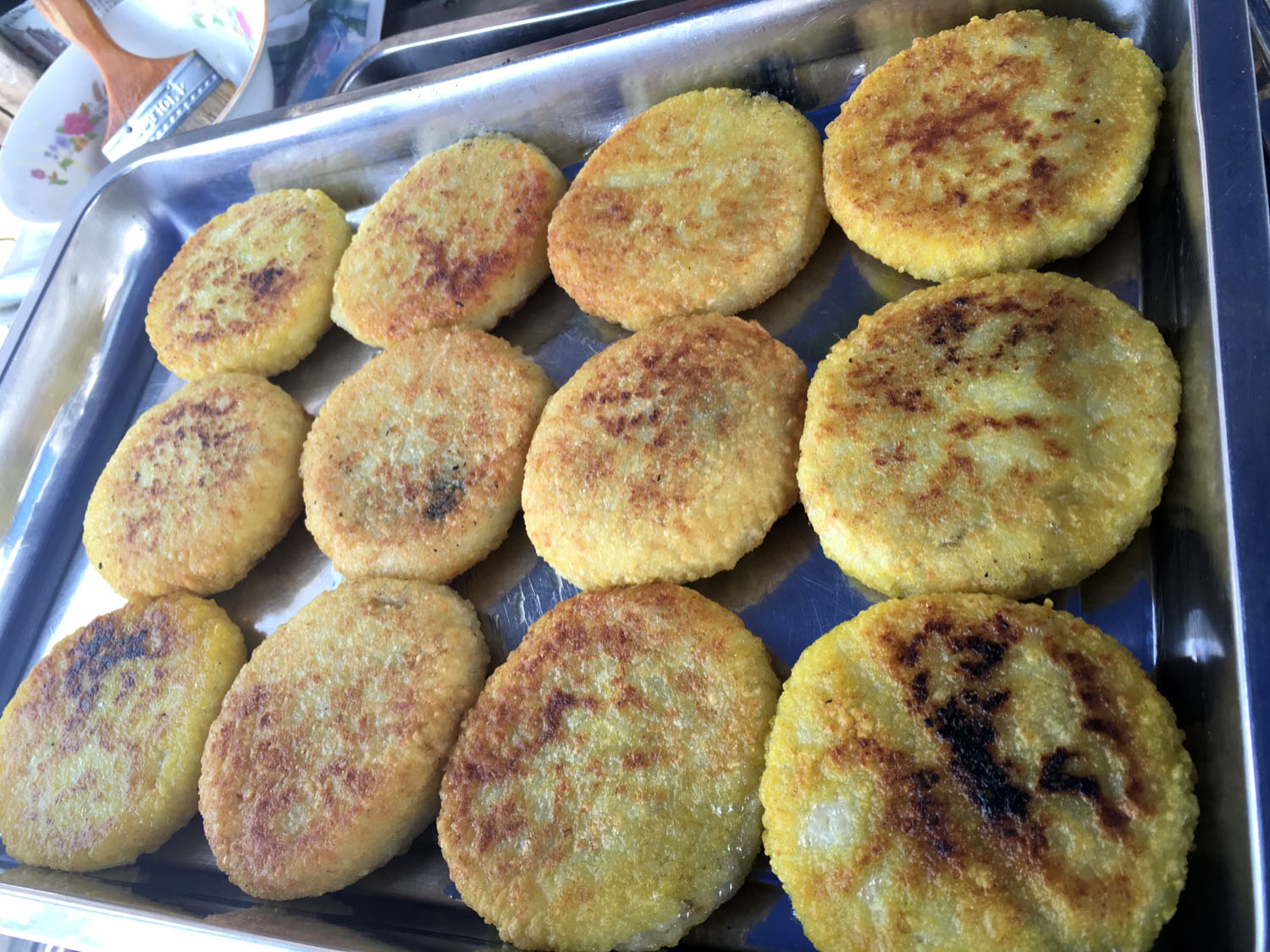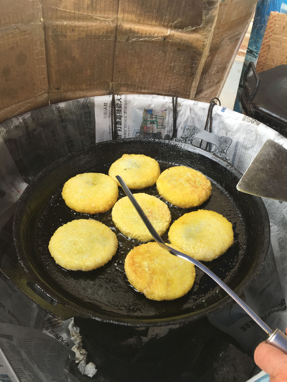 油酥餅(圖3-4)、糍團(tuán)餅(圖5-6)、韭菜餅(圖7-8)   油酥餅每天晚上做,涼了更好吃,更酥更脆,里面都是很香的黑芝麻;糍團(tuán)餅,每天中午擺攤熱了煎鍋開(kāi)始煎,糯米做成,用菜籽油煎至金黃,餡兒是黑芝麻瓜子仁;韭菜餅是最受歡迎的,每天都有好多人排隊(duì)來(lái)買。供應(yīng)時(shí)間:每年的4月份到11月份 下午1點(diǎn)到5點(diǎn)半。