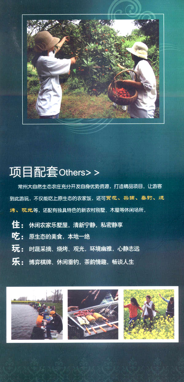 農(nóng)莊設(shè)有綠色采摘、休閑垂釣、珍禽養(yǎng)殖、餐飲養(yǎng)生等項目,主要為“家庭郊游、朋友聚會、商務(wù)交流、企業(yè)配送”等提供優(yōu)質(zhì)服務(wù)及場所。