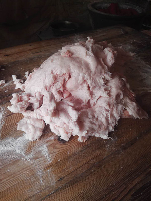 常州大麻糕已經(jīng)有150多年的歷史,常武各地的麻糕師傅、麻糕店數(shù)不勝數(shù),但今天小編要帶大家去的是一家隱藏在背街小巷里,至今仍保持著傳統(tǒng)手工制法的麻糕店。 沈正昌麻糕店位于遙觀鎮(zhèn)東街、國寧寺旁,雖然店門口連個招牌都沒有,卻不妨礙四面八方的食客慕名而來,大伙看中的正是這些純手工制作,原汁原味的大麻糕。如今的店主沈國平已經(jīng)是沈家第四代做麻糕的傳人了。 秉承著爺爺那輩傳下來的手藝,他們制作的麻糕塊大實誠,用料講究,口感酥軟,深受四周鄉(xiāng)鄰的歡迎!拔覀冞是老法,酥是生板油身擦的,餡里也是生板油摻糖,是真的綠色產(chǎn)品,沒有添加劑,沒有防腐劑,也不用甜蜜素,都是真家伙。” 每天凌晨一兩點鐘,沈國平就要去采買當(dāng)天最新鮮的豬板油,回來清理干凈,和上面粉攪拌均勻,制成面團。麻糕的制作主要由沈國平妻子和兩個姊妹來完成。揉面、搓胚子、配油酥,按餡心、搟均勻,整個過程行云流水,連貫無比。 當(dāng)爐火燒得正旺,溫度能高達近300度,沈國平就上場了,赤手空拳,一撈一貼,一秒鐘的功夫,就把麻糕貼到了桶壁上。不過幾分鐘的功夫,麻糕就出爐了。經(jīng)過炭火爐子烤出來的,比一些電烤爐烤出的更香、更脆。