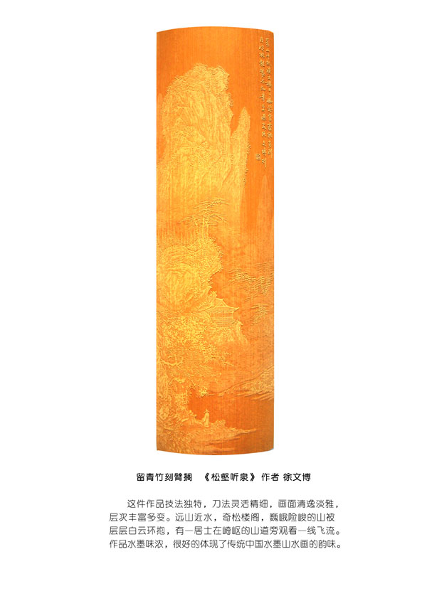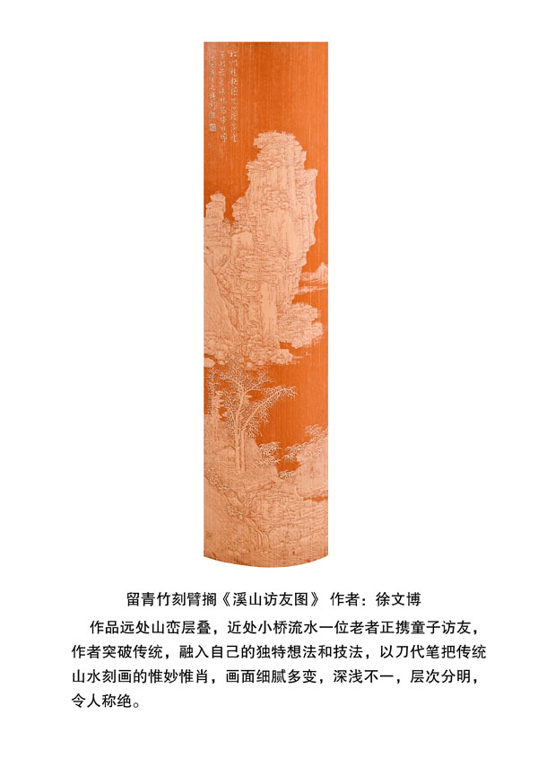 徐博(藝名文博),1973年生,江蘇武進(jìn)人,江蘇省省名人,高級(jí)工藝美術(shù)師,常州市留青竹刻非遺傳承人,常州工藝美術(shù)家協(xié)會(huì)理事,被譽(yù)為當(dāng)今中國(guó)最具創(chuàng)新意識(shí)的新銳竹刻家代表,多次獲得國(guó)家工藝美術(shù)大獎(jiǎng)?釔(ài)留青竹刻的徐文博賞竹為樂(lè),以竹詠志,借竹抒懷,悉心探索留青竹刻的藝術(shù)表現(xiàn)。在中國(guó)工藝美術(shù)大師蕭劍波的精心指導(dǎo)下,開(kāi)創(chuàng)留青水墨山水之技法,更好的體現(xiàn)了竹刻淡雅清秀的藝術(shù)風(fēng)格,并不斷汲取書(shū)畫(huà)、攝影、雕塑等藝術(shù)精華,不斷滋養(yǎng)藝術(shù)情趣,提升擴(kuò)展胸襟人格的同時(shí)也逐步形成了其形神兼?zhèn),虛?shí)相生,氣韻生動(dòng)的藝術(shù)特點(diǎn),作品為眾多的國(guó)內(nèi)外收藏家珍藏。
