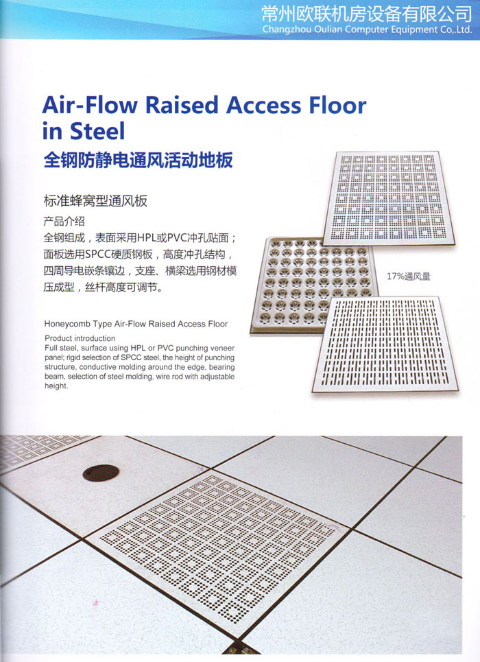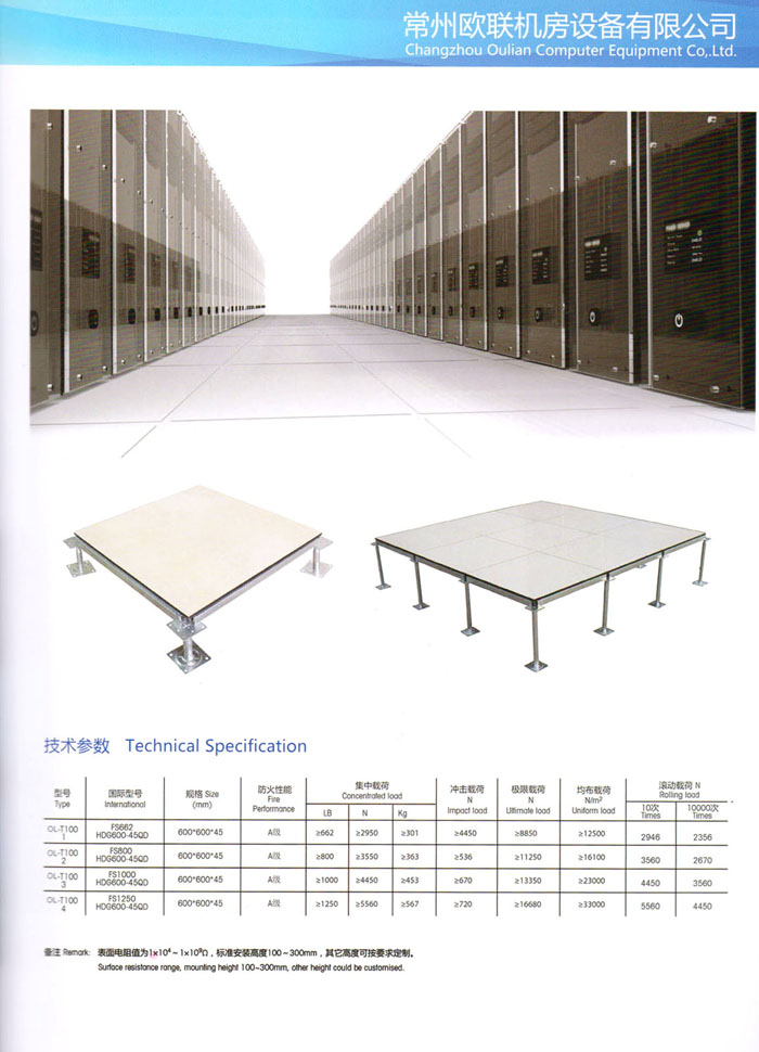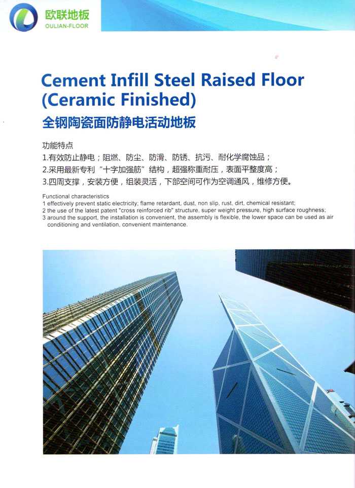 防靜電高架活動地板、全鋼地板、陶瓷地板是計算機行業(yè)發(fā)展起來的新型鋪地材料,隔離了潮氣、靜電灰塵,最重要的是解決了綜合布線問題,無需預(yù)埋管線,可隨時拆卸、搬移,保證了資訊設(shè)備完整的優(yōu)點,適應(yīng)了智能化樓宇中信息自動化技術(shù)對所處環(huán)境的特定要求,避免了廣大客戶的雙重投資,使現(xiàn)代化辦公程度更加高效,辦公場所更加舒適。 “歐聯(lián)”系列全鋼地板,符合國家安全要求,種類完備多樣,其中防靜電陶瓷地板、硫酸鈣地板等除具有普通瓷質(zhì)的裝飾和實用性外,其耐磨、防水、防火功能優(yōu)于其它同類產(chǎn)品,防靜電系列地板,能切合不同客戶的要求,其靈活的配置,深受客戶歡迎,不同材質(zhì)的地板結(jié)構(gòu)使設(shè)計師的設(shè)計空間比傳統(tǒng)的更加廣闊自由和善變。 公司大力發(fā)展國內(nèi)外銷售業(yè)務(wù),多次中標國內(nèi)重點工程 ,例:哈爾濱醫(yī)科大學(xué)、山東大學(xué)、上海普通機場等。 公司將一如既往開發(fā)和制造一流的產(chǎn)品,愿與廣大有識之士合作發(fā)展,共創(chuàng)美好未來。