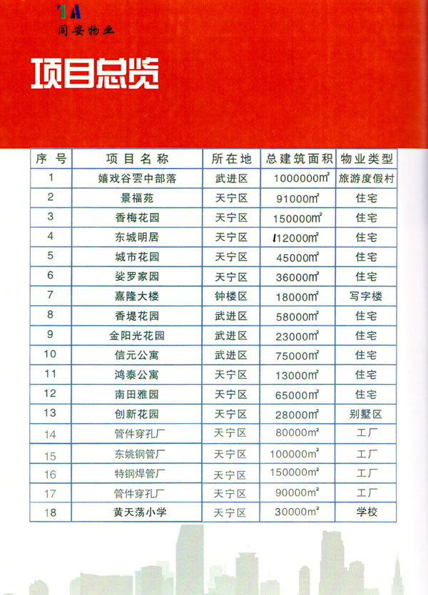 常州市同安物業(yè)管理有限公司注冊1999年,發(fā)展至今已有多年歷史,本公司坐落于美麗的龍城常州,秉承“融聚無限未來”的核心理念,融專業(yè)認(rèn)才,匯優(yōu)質(zhì)資源以”專心,細(xì)心,耐心”的服務(wù)態(tài)度,為客戶打造“安心,順心,稱心”的服務(wù)感受。 公司始終以“打造中國最值得信賴和最值得尊重的物業(yè)管理服務(wù)集成商”為愿景自我鞭策,不斷前行。同安物業(yè)以客戶滿意為終極目標(biāo),不斷加強(qiáng)”崗位資格認(rèn)證能力,人才招聘與職業(yè)化培訓(xùn)能力,產(chǎn)品策劃與管理設(shè)計(jì)能力,品質(zhì)監(jiān)督與管控能力,技術(shù)更新與運(yùn)營優(yōu)化力“五大專業(yè)能力的培養(yǎng)和提升,實(shí)現(xiàn)“精品化管理,專業(yè)化服務(wù)”。 公司發(fā)展至今,員工總數(shù)近千余人,大專以上學(xué)歷200多人,中高級技術(shù)人員160人,維修人員140人,物業(yè)管理師80名,公司接管面積達(dá)3100000多平方米,設(shè)涉及住宅小區(qū),別墅,大型游樂場,公園,醫(yī)院,廠區(qū),商業(yè)等。公司的工作管理逐步導(dǎo)入ISO9001質(zhì)量體系和ISO4001環(huán)境管理體系和GB/T28001職業(yè)健康安全管理體系,嚴(yán)格按照質(zhì)量體系的標(biāo)準(zhǔn)執(zhí)行。