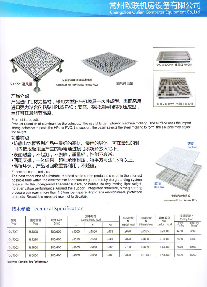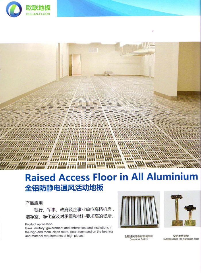 防靜電高架活動(dòng)地板、全鋼地板、陶瓷地板是計(jì)算機(jī)行業(yè)發(fā)展起來(lái)的新型鋪地材料,隔離了潮氣、靜電灰塵,最重要的是解決了綜合布線問題,無(wú)需預(yù)埋管線,可隨時(shí)拆卸、搬移,保證了資訊設(shè)備完整的優(yōu)點(diǎn),適應(yīng)了智能化樓宇中信息自動(dòng)化技術(shù)對(duì)所處環(huán)境的特定要求,避免了廣大客戶的雙重投資,使現(xiàn)代化辦公程度更加高效,辦公場(chǎng)所更加舒適。 “歐聯(lián)”系列全鋼地板,符合國(guó)家安全要求,種類完備多樣,其中防靜電陶瓷地板、硫酸鈣地板等除具有普通瓷質(zhì)的裝飾和實(shí)用性外,其耐磨、防水、防火功能優(yōu)于其它同類產(chǎn)品,防靜電系列地板,能切合不同客戶的要求,其靈活的配置,深受客戶歡迎,不同材質(zhì)的地板結(jié)構(gòu)使設(shè)計(jì)師的設(shè)計(jì)空間比傳統(tǒng)的更加廣闊自由和善變。 公司大力發(fā)展國(guó)內(nèi)外銷售業(yè)務(wù),多次中標(biāo)國(guó)內(nèi)重點(diǎn)工程 ,例:哈爾濱醫(yī)科大學(xué)、山東大學(xué)、上海普通機(jī)場(chǎng)等。 公司將一如既往開發(fā)和制造一流的產(chǎn)品,愿與廣大有識(shí)之士合作發(fā)展,共創(chuàng)美好未來(lái)。