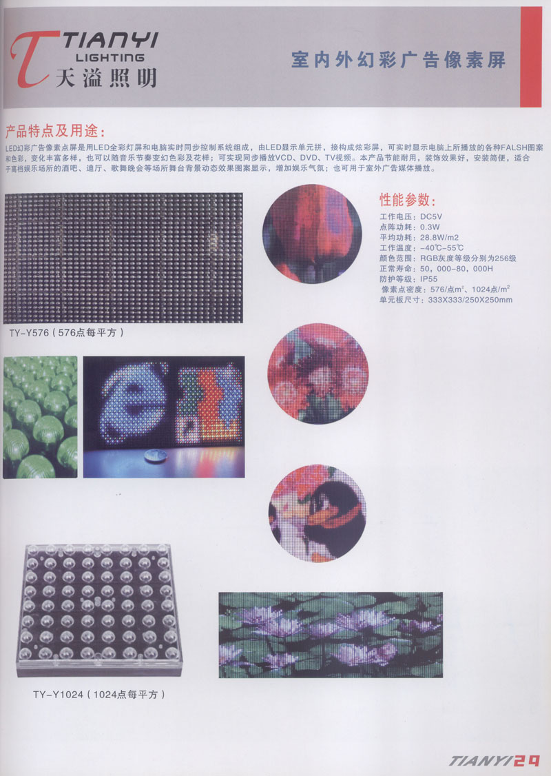 天溢照明是中國(guó)領(lǐng)先的專(zhuān)業(yè)從事LED廣告照明裝飾燈具設(shè)計(jì)、系統(tǒng)開(kāi)發(fā)、燈具制造、工程服務(wù)一體的專(zhuān)業(yè)型公司,本公司產(chǎn)品已廣泛應(yīng)用于全國(guó)大多數(shù)城市夜景亮化景觀照明、酒店休閑娛樂(lè)夜場(chǎng)夢(mèng)幻燈光、戶(hù)內(nèi)外廣告宣傳、建筑及室內(nèi)照明以及家居裝飾等場(chǎng)合。 本公司產(chǎn)品涵蓋景觀裝飾照明、商用照明、居家照明、信息廣告顯示等領(lǐng)域,我們將性能可靠與適中價(jià)格的LED全系列產(chǎn)品帶到世界各個(gè)、角落。