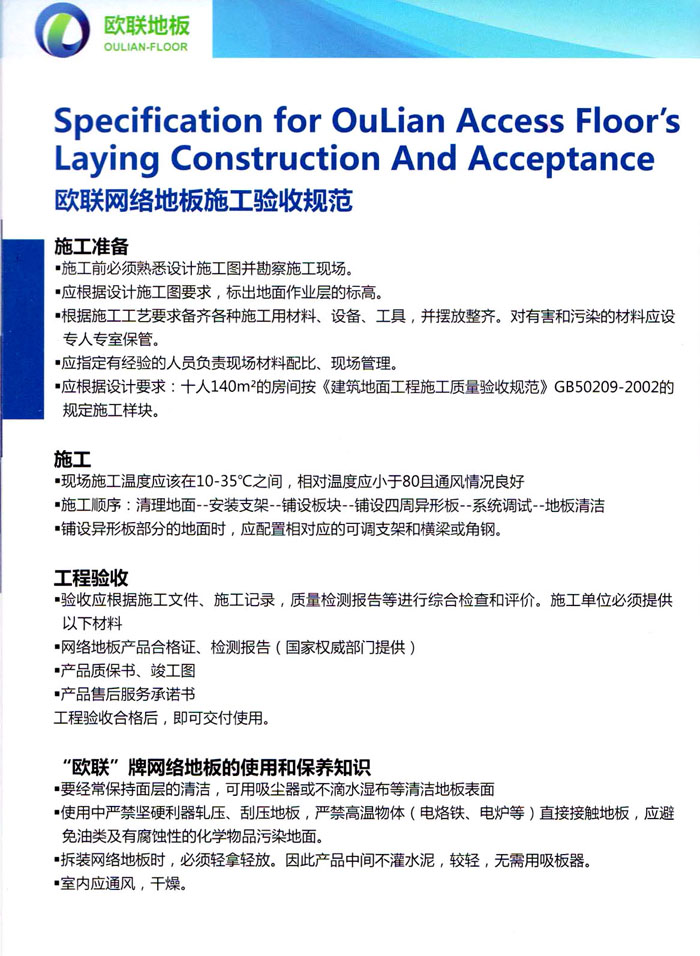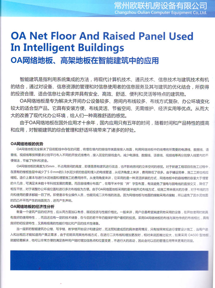 防靜電高架活動(dòng)地板、全鋼地板、陶瓷地板是計(jì)算機(jī)行業(yè)發(fā)展起來(lái)的新型鋪地材料,隔離了潮氣、靜電灰塵,最重要的是解決了綜合布線(xiàn)問(wèn)題,無(wú)需預(yù)埋管線(xiàn),可隨時(shí)拆卸、搬移,保證了資訊設(shè)備完整的優(yōu)點(diǎn),適應(yīng)了智能化樓宇中信息自動(dòng)化技術(shù)對(duì)所處環(huán)境的特定要求,避免了廣大客戶(hù)的雙重投資,使現(xiàn)代化辦公程度更加高效,辦公場(chǎng)所更加舒適。 “歐聯(lián)”系列全鋼地板,符合國(guó)家安全要求,種類(lèi)完備多樣,其中防靜電陶瓷地板、硫酸鈣地板等除具有普通瓷質(zhì)的裝飾和實(shí)用性外,其耐磨、防水、防火功能優(yōu)于其它同類(lèi)產(chǎn)品,防靜電系列地板,能切合不同客戶(hù)的要求,其靈活的配置,深受客戶(hù)歡迎,不同材質(zhì)的地板結(jié)構(gòu)使設(shè)計(jì)師的設(shè)計(jì)空間比傳統(tǒng)的更加廣闊自由和善變。 公司大力發(fā)展國(guó)內(nèi)外銷(xiāo)售業(yè)務(wù),多次中標(biāo)國(guó)內(nèi)重點(diǎn)工程 ,例:哈爾濱醫(yī)科大學(xué)、山東大學(xué)、上海普通機(jī)場(chǎng)等。 公司將一如既往開(kāi)發(fā)和制造一流的產(chǎn)品,愿與廣大有識(shí)之士合作發(fā)展,共創(chuàng)美好未來(lái)。